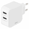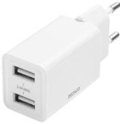 Caricabatterie da parete di DELTACO con doppie porte USB-A per la ricarica simultanea di due dispositivi fino a 2,4 A / 12 W per porta.