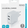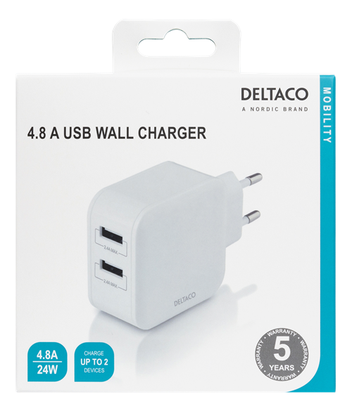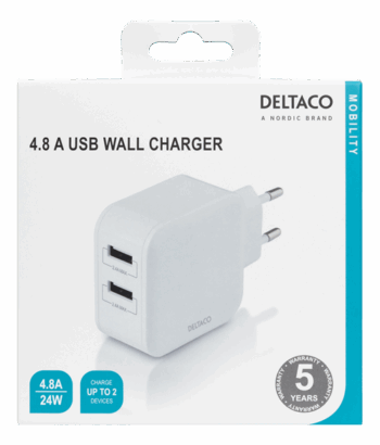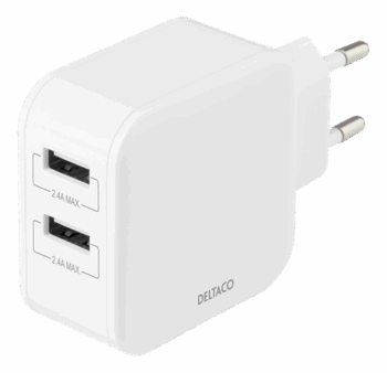 DELTACO Caricatore da parete con doppia porta USB-A, 4,8 A, 24 W, bianco