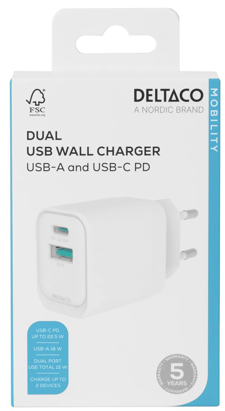 Caricatore DELTACO da muro USB, 1x USB-A 18 W, 1x USB-C PD 20 W, bianco
