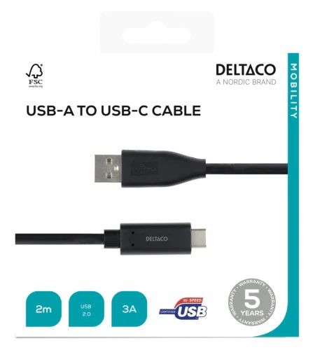 Cavo DELTACO da USB-C a USB-A, 2mt, 3A, USB 2.0, nero