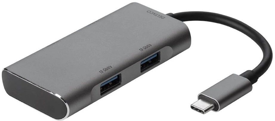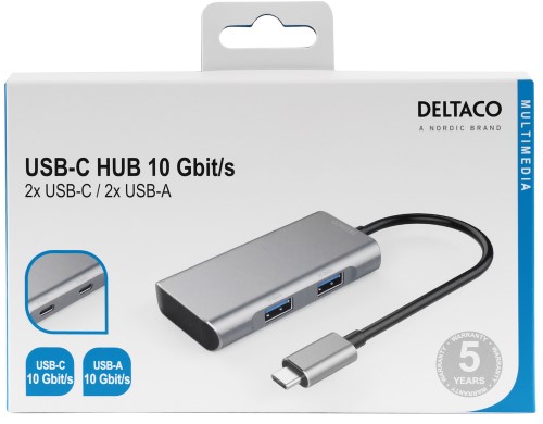 L’hub DELTACO USB-C è progettato per collegare contemporaneamente due dispositivi USB-C e due USB-A. Entrambe le porte USB-C e entrambe le porte USB-A possono essere utilizzate per il trasferimento dati fino a 10 Gb/s e per la ricarica dei dispositivi collegati, ad es. telefoni cellulari, tablet o dischi rigidi esterni.
